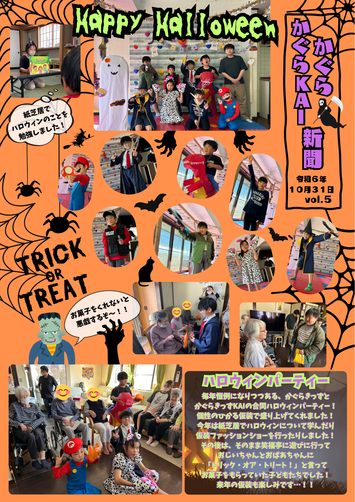 かぐら・かぐらKAI新聞📰vol.5(ハロウィンパーティー) 公開済み: 2024年10月31日更新: 2024年11月12日作成者: sunsカテゴリー: かぐら新聞 HAPPY HALLOWEEN🎃 10月は合同でハロウィンパーティーを行いました! みんなで仮装して大盛り上がりのパーティーでした✨ 当日の様子を是非ご覧下さい🤲 かぐら・かぐらKAI新聞📰 関連記事 31 かぐら新聞📰vol.10 3月もたくさんのイベントを行いました! 公園・スライム作り・紙漉き体験・免許センター見学・キャンプ体験などなど… どのイベントも楽しみながら参加出来ていた子どもたちです✨ イベントの様子を掲載してありますので是非ご覧下さ […] 公開済み: 2025年3月31日更新: 2025年3月31日作成者: sunsカテゴリー: かぐら新聞 06 かぐら新聞📰令和7年度4月号 4月もたくさんのイベントを行いました! イベントの様子を掲載してありますので是非ご覧下さい🙇♂️ 5月もよろしくお願いいたします🤲 ⇩⇩⇩⇩⇩⇩⇩⇩ かぐら新聞📰 公開済み: 2025年5月6日更新: 2025年5月6日作成者: sunsカテゴリー: かぐら新聞 11 かぐら新聞📰令和7年度7月号 7月も色んなイベントを行いました! イベントの様子を掲載してありますので是非ご覧下さい🙇♂️ 8月も引き続きよろしくお願いいたします🤲 ⇩⇩⇩⇩⇩⇩⇩⇩ かぐら新聞📰 公開済み: 2025年8月11日更新: 2025年8月8日作成者: sunsカテゴリー: かぐら新聞